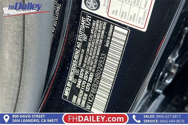 This vehicle is equipped with: Driver Assistance Package (Active Brake Assist w/Cross-Traffic Function, Active Distance Assist DISTRONIC®, Active Lane Change Assist, Active Speed Limit Assist, Active Steering Assist, Extended Restart in Stop & Go Traffic, PRE-SAFE® Impulse Side, PRE-SAFE® PLUS Rear-End Collision Protection, and Route-Based Speed Adaptation w/End-of Traffic-Jam), Exterior Lighting Package (LED Intelligent Light System), Warmth & Comfort Package (Heated Armrest, Heated Steering Wheel, and Rapid Heating Front Seats), 4MATIC®, 4-Wheel Disc Brakes, 8 Speakers, ABS brakes, Adaptive Highbeam Assist, Air Conditioning, Alloy wheels, AM/FM radio: SiriusXM, Android Auto®, Anti-whiplash front head restraints, Apple CarPlay®, Apple CarPlay®/Android Auto®, Auto High-beam Headlights, Auto tilt-away steering wheel, Auto-dimming door mirrors, Auto-dimming Rear-View mirror, Automatic temperature control, Black Headliner, Brake assist, Bumpers: body-color, Burmester® Surround Sound System, Center Console in Natural Grain Brown Ash Wood, Delay-off headlights, Driver door bin, Driver vanity mirror, Dual front impact airbags, Dual front side impact airbags, Electronic Stability Control, Emergency communication system: Mercedes me connect, Extended Mobility Tires, Exterior Parking Camera Rear, Four wheel independent suspension, Front anti-roll bar, Front Bucket Seats, Front Center Armrest, Front dual zone A/C, Front reading lights, Fully automatic headlights, Garage door transmitter: HomeLink, Genuine wood console insert, Genuine wood dashboard insert, Genuine wood door panel insert, Head restraints memory, Heated door mirrors, Heated Front Seats, Heated front seats, Illuminated entry, Knee airbag, Leather Shift Knob, Low tire pressure warning, MB-Tex Dashboard w/Contrast Stitching, MB-Tex Upholstery, Memory seat, Navigation system: MBUX, Occupant sensing airbag, Outside temperature display, Overhead airbag, Overhead console, Panic alarm, PARKTRONIC w/Active Parking Assist, Passenger door bin, Passenger vanity mirror, Power adjustable front head restraints, Power adjustable rear head restraints, Power door mirrors, Power driver seat, Power moonroof, Power passenger seat, Power steering, Power windows, Radio data system, Radio: MBUX Infotainment System w/Navigation, Rain sensing wipers, Rear anti-roll bar, Rear fog lights, Rear reading lights, Rear seat center armrest, Rear window defroster, Remote keyless entry, Security system, SiriusXM Radio, Smartphone Integration, Speed control, Speed-sensing steering, Split folding rear seat, Steering wheel memory, Steering wheel mounted audio controls, Surround View System, Tachometer, Telescoping steering wheel, Tilt steering wheel, Traction control, Trip computer, Turn signal indicator mirrors, Variably intermittent wipers, Weather band radio, and Wheels: 18 x 8.0 Twin 5-Spoke Family Owned and Operated for Since 1910 FH Dailey Chevrolet has been serving San Leandro and the San Francisco, Oakland Bay Area since 1910. We work hard so you don't have too.